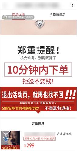 这种广告点开之后的画风一般都是这样的 —— 文案咋咋呼呼、页面设计简单粗暴、不讲究什么审美,只要能抓住消费者眼球就行: