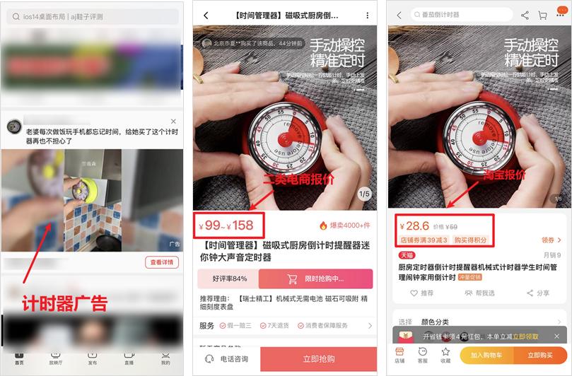像这款计时器,二类电商的报价是 99-158,但是我们用同样的图片在淘宝上随便一搜,发现只需要 20 几块钱就可以买到: