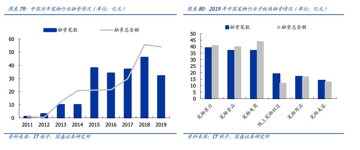 在最近几年一级市场的萎靡之下,2019年中国宠物行业共获得融资笔数 32 笔,融资总金额达到 54.1 亿元;其中,宠物医疗、宠物食品和宠物电商三个子板块融资次数最多、金额最大。