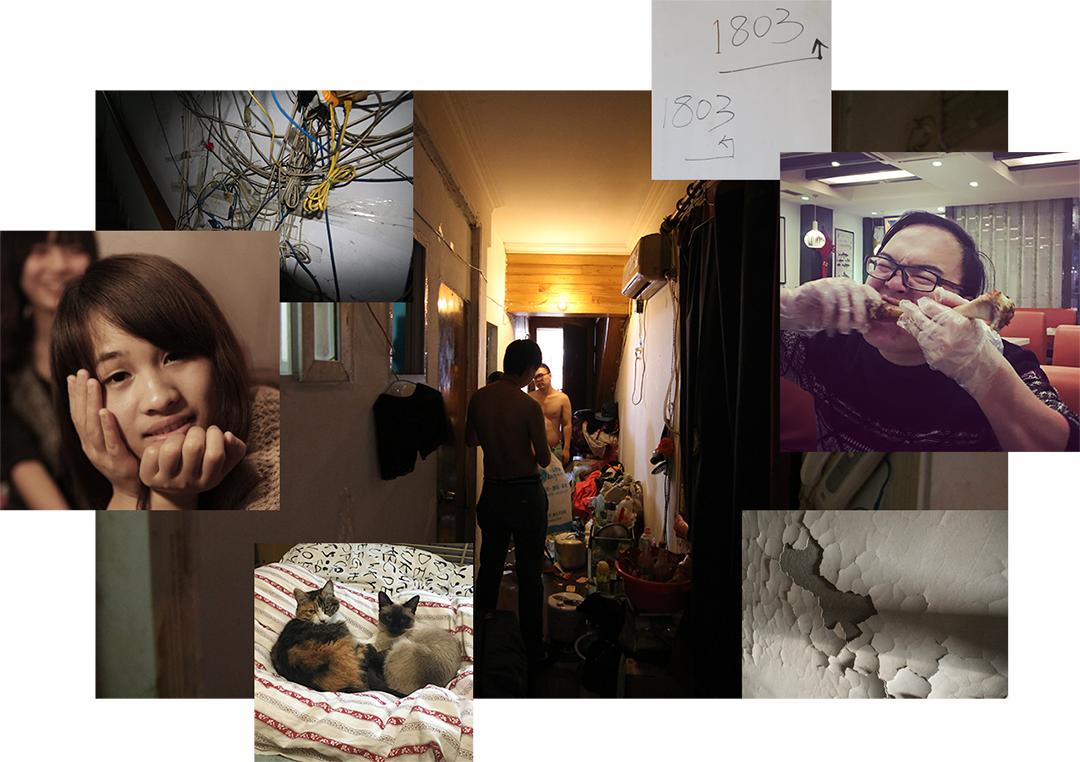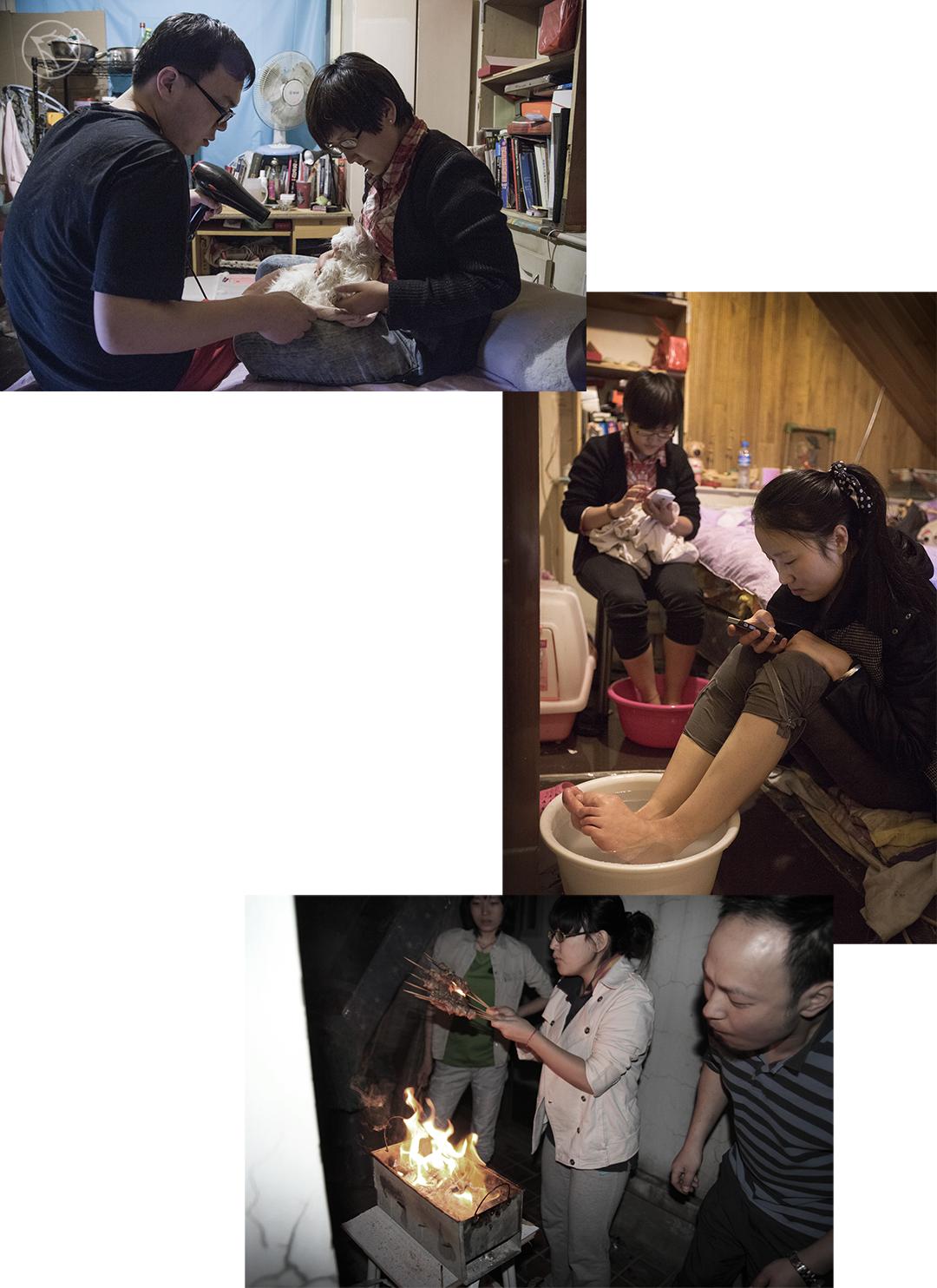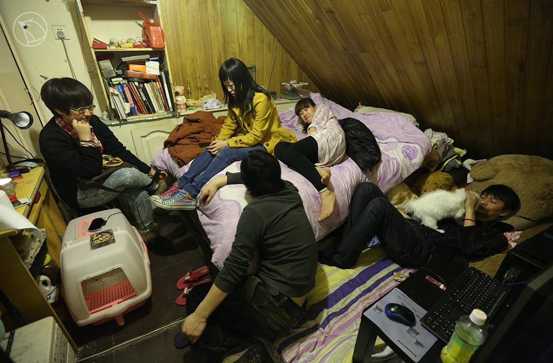 2013年,杨洁(左一)在她没有窗户的房间。