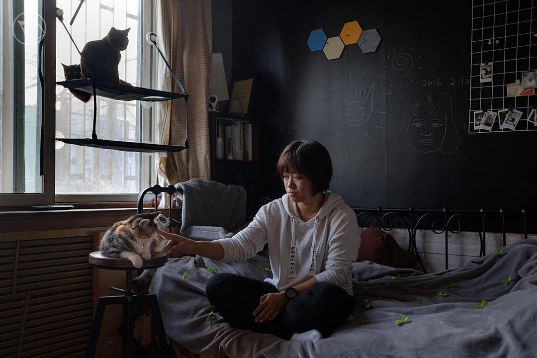北烨在屋子里,与3只猫相伴。摄影丨徐阳