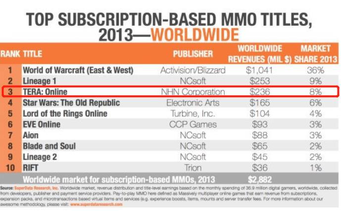 蓝洞是幸运的,依靠《TERA》顺利走出国门,打开了全球市场,并专门成立了En Masse Entertainment来负责游戏的发行工作。根据Superdata公布的数据,《TERA》2013年位列MMO第三位。