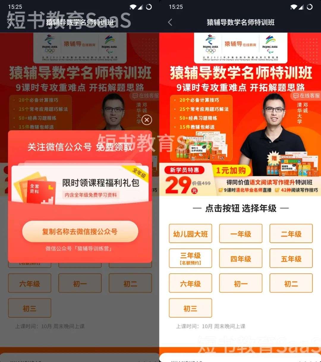 通过免费的福利,吸引潜在客户关注公众号,就可以直接进入体验课页面。不是单一的一节体验课,而是猿辅导全科目的体验课从小学—初中—高中。