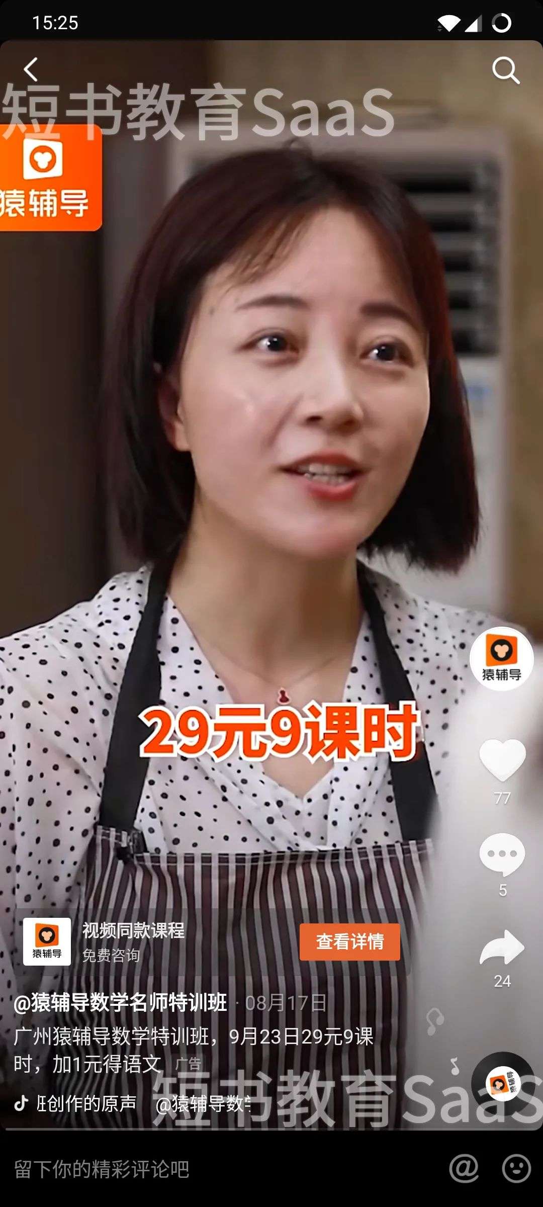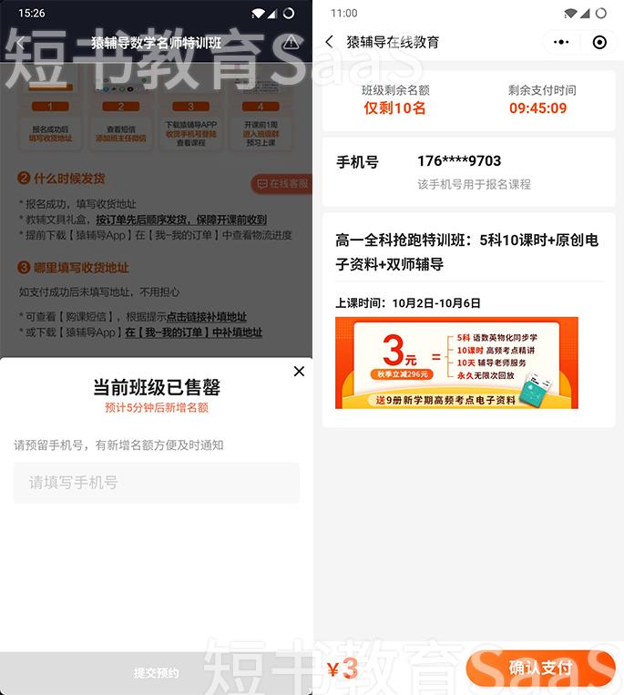 第二点是,如果潜在客户有购买课程的欲望,需要在抖音平台等待五分钟才可以购买。这是猿辅导区别传统引流课的做法,这样售罄的状态,更加凸显课程的热度和客户的购买紧迫感。