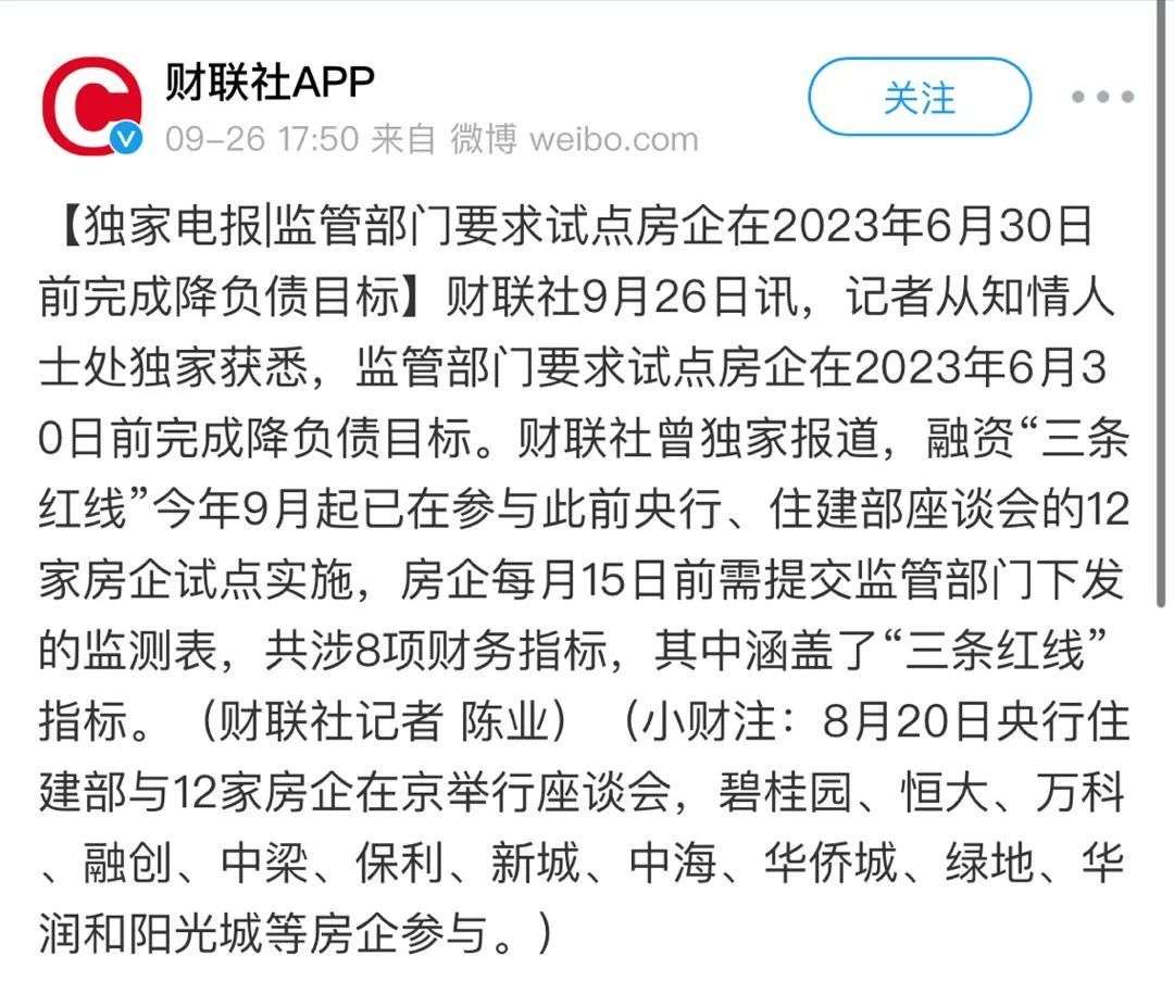 周末,财联社发了一条独家消息:监管部门要求试点房企在2023年6月30日前完成降负债目标。