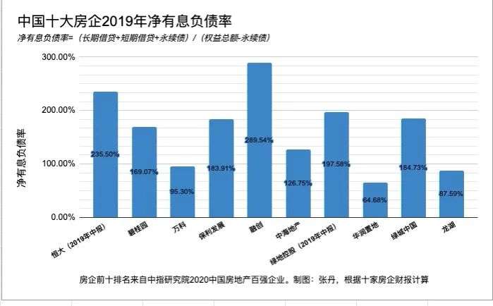 融创虽然一年内到期有息负债比恒大少,但根据2019年年报数据,其净有息负债率比恒大还高。