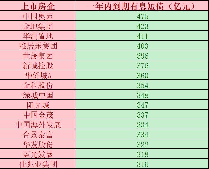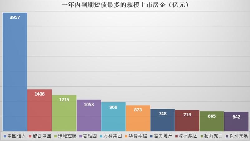 其中一年内到期有息负债超过1000亿元的有4家:恒大、融创、绿地、碧桂园。