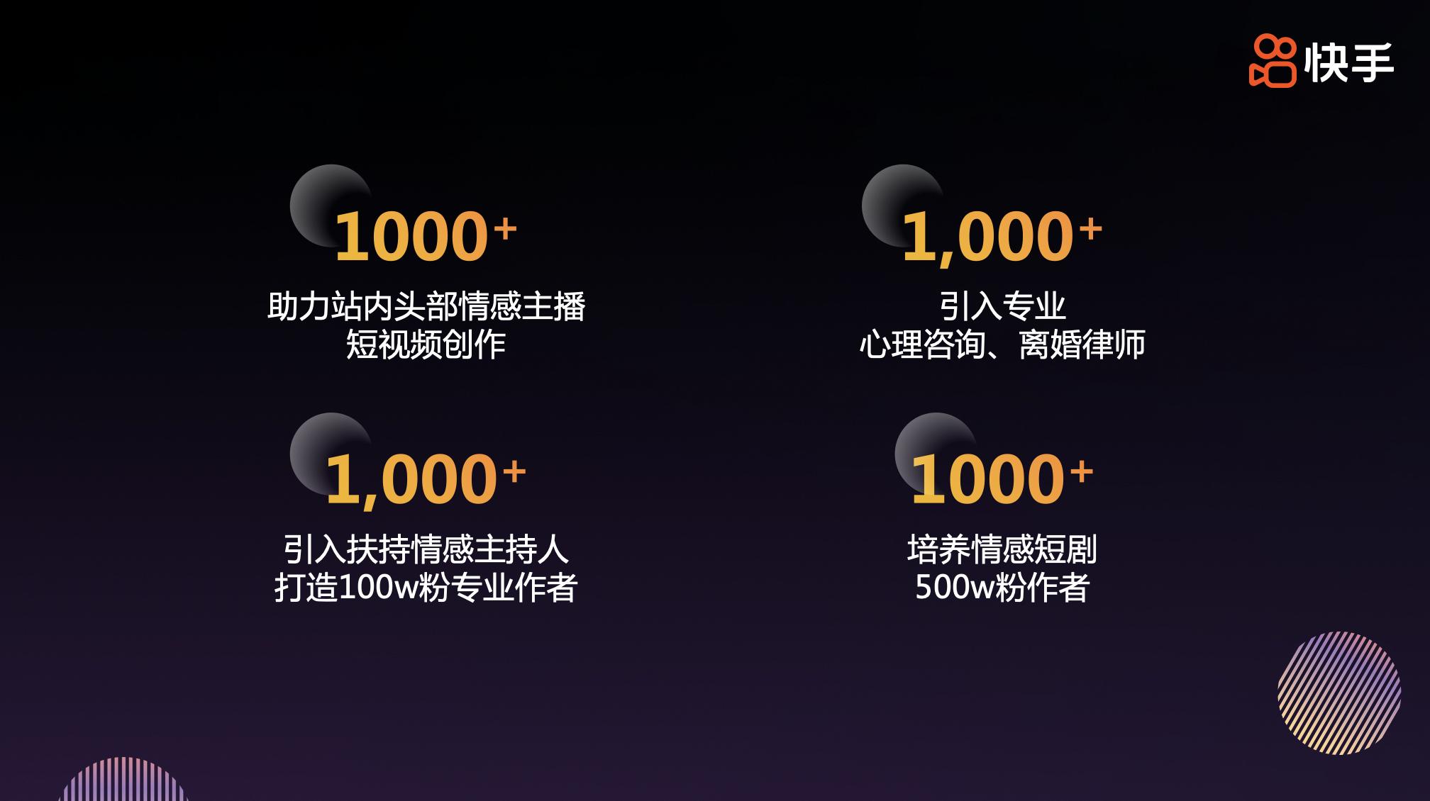 活动中,快手重磅发布快手情感“光合计划”,通过该计划,快手今年将投入超百亿曝光资源重点扶持情感优质创作者,并加码打造“四个1000+”,具体内容包括助力站内头部情感直播主播增加短视频内容供给达1000+,引入专业心理咨询、离婚律师达1000+,引入扶持情感主持人、打造100万粉专业作者达1000+,培养情感短剧500万粉作者达1000+。