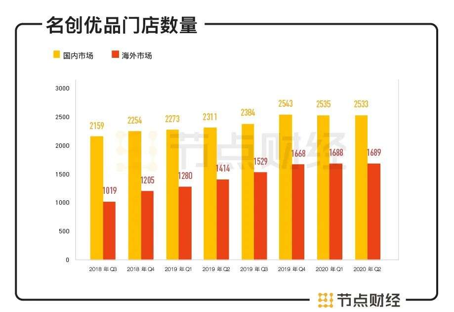 2018年名创优品门店数量超过3000家,截至2020年6月30日,这个数目已达到4222家,其中,中国市场门店2533家,海外市场1689家。