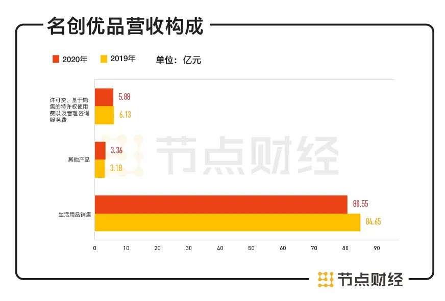 值得注意的是,这些门店中,直营门店占比仅为3.1%,包括加盟店和经销商门店在内的第三方门店占比高达96.9%。也就是说,名创优品不需要过多地承担开店的租金、装修、维修等费用,而主要是侧重品牌营销整合、供应链运营管理,相对加盟者属于轻资产模式。