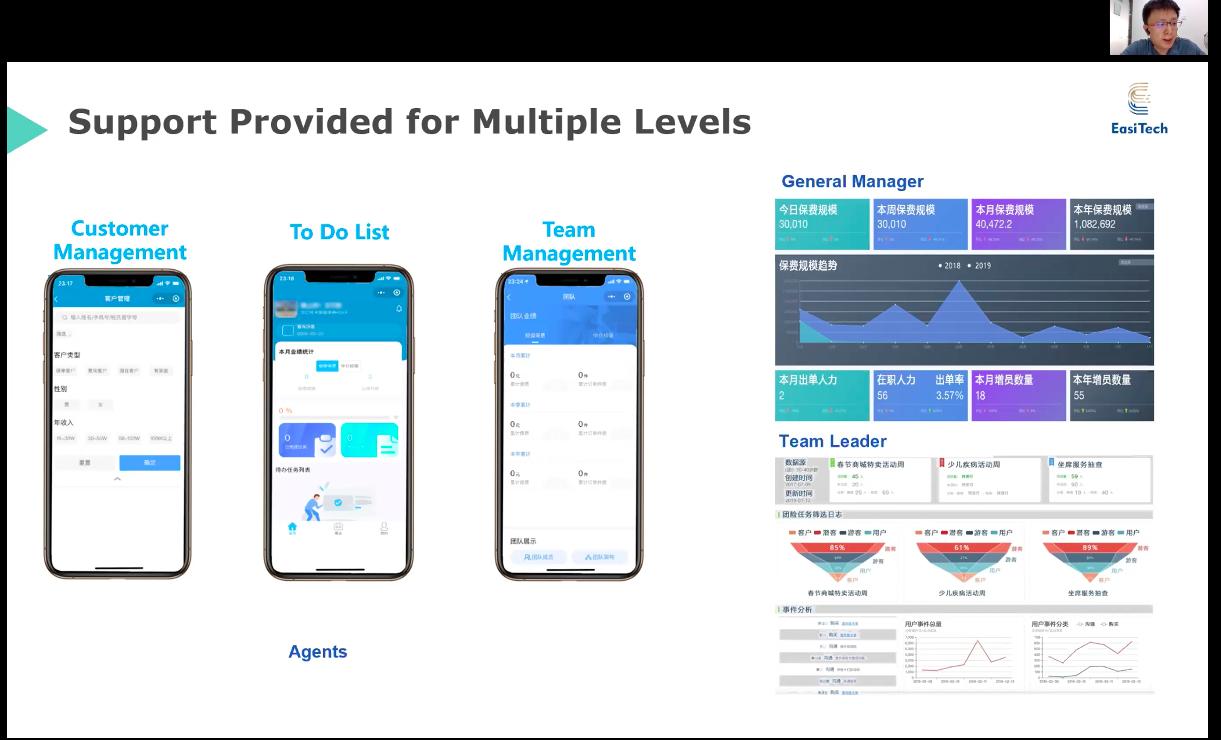 对于传统保险企业来说,如何以更便利的方式提供服务以及更流畅地实现销售管理是数字化转型的重点方向之一。在本次线上跨境分享会上, EasiTech 海外 CEO Wendy 女士预告在2020年 Q4 会推出继续升级针对保险销售代表的 EasyI 展业营销工具 V2.0 ,以进一步满足保险机构全面数字化运营的强烈诉求。