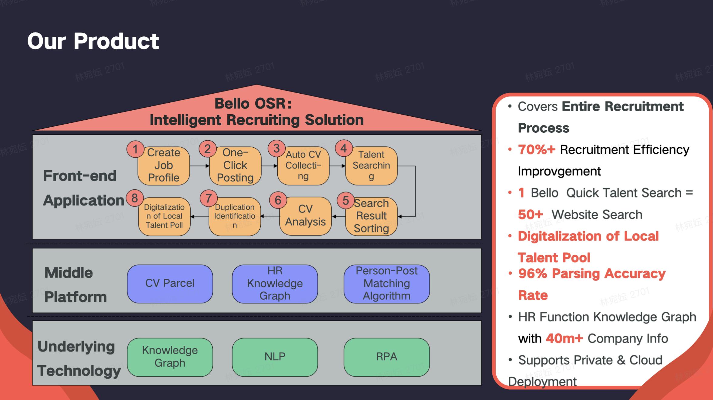 在底层技术方面,Bello 提供如知识图谱、解析器、人岗匹配等核心技术。这类产品针对那些对招聘系统及智能化要求较高的大企业。像腾讯、平安、今日头条等,都是 Bello 的客户。