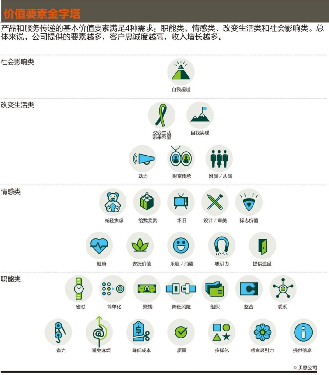 我们找出了“30种价值要素”,即最基础、离散的基本特征。这些要素可归为4类:职能类、情感类、改变生活类和社会影响类。有些要素指向内在,主要解决消费者个人需求。其他要素指向外在,帮助客户与外部世界互动或应对外部挑战。