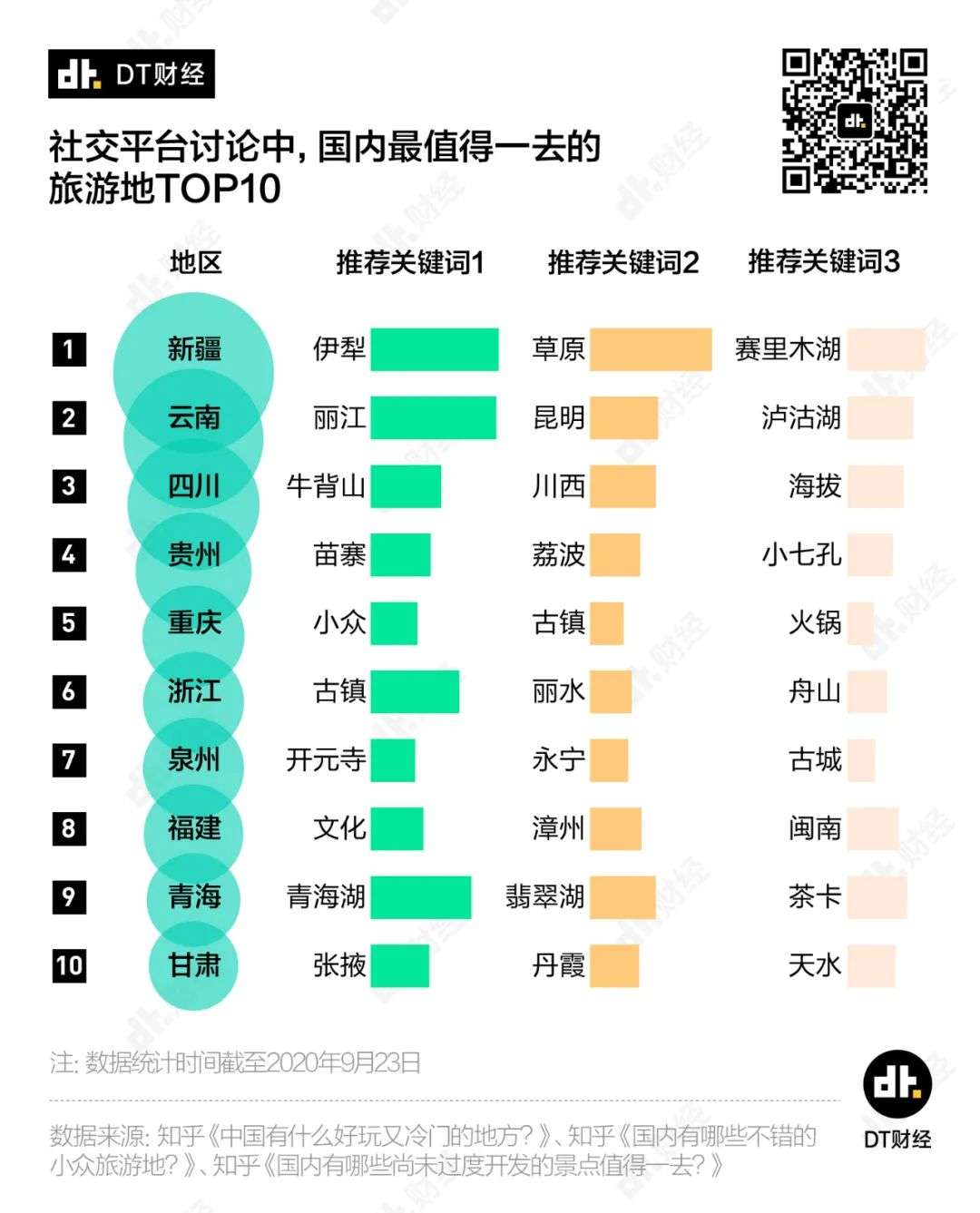 这份清单除了为大家列出了最让人惊喜的旅游地区和城市,也从网友们的推荐理由中给大家划好了重点。比如,去新疆,你不可错过伊犁的风光和赛里木湖。去四川,你可以试试没有那么知名但风景别致的牛背山。