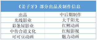 根据《姜子牙》片尾序幕信息来看,此次参与了电影出品及制作,并由光线传媒持股的企业(包括光线100%控股企业)至少有8家动漫公司。其中,光线影业及彩条屋影业负责投资与发行,中传合道与可可豆动画负责电影制作,大千阳光、红鲤动画、红鲸影视(红鲤动画子公司)、魅力文化四家企业负责电影的中后期加工。