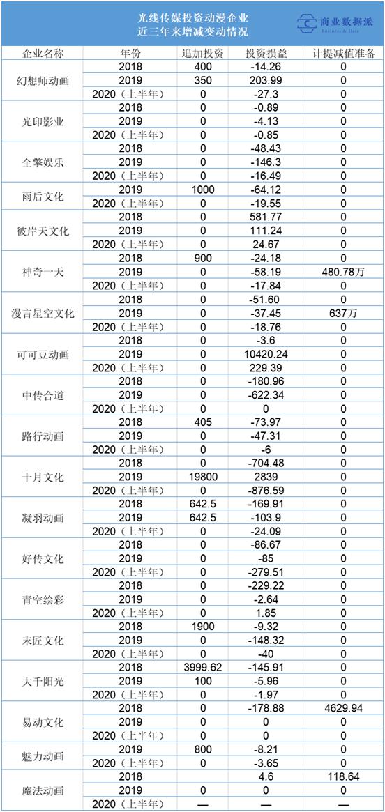 虽然光线传媒的文娱投资版图并不止于动漫领域,但根据2020年中报来看,光线传媒投资的近50家企业中,共计造成了4807.70万元的投资亏损。所以,光线的投资动作除了满足现阶段的业务版图之外,从财务角度的长远性来看,还需要时间来给出答案。