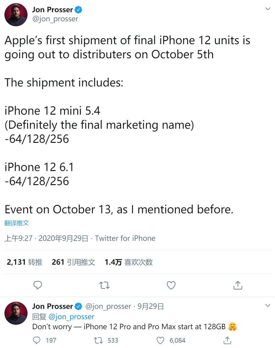 消息中指出,iPhone 12系列将从10月5日开始向全球各地经销商发货,搭载5.4英寸屏幕的iPhone 12 mini有64GB/128GB/256GB三种存储规格可选,搭载6.1英寸屏幕的iPhone 12的存储规格同上。