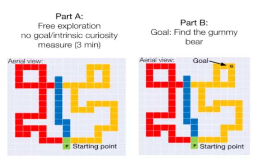 就拿前面提到的深度优先搜索(DFS)来说,科学家们发现,如果让孩子们自由探索,那么他们与智能体按DFS做出的行动有90%的相似,而以目标为导向(找到橡皮糖)来探索的话,有96%的路线都是相似的。但不同的是,探索越多的孩子,最后能花费更少的时间完成任务,智能体却相反。