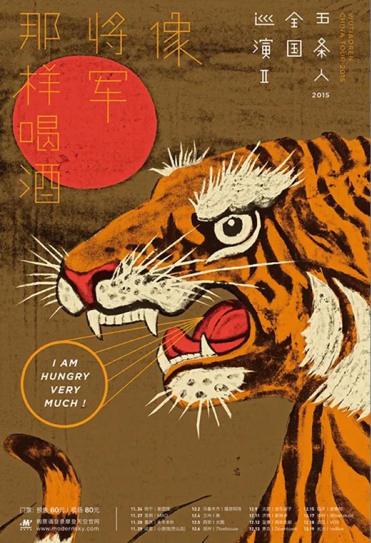 更为重要的是,经过专业美学训练的胡镇超为五条人注入了更多现代性因素。拼贴解构、观念摄影、涂鸦符号、图形变异等各种现代设计方法都统统被胡镇超运用到了设计中,“回到海丰”演唱会海报中,用瓜子、花生拼出来的吉他,gif动画中在海上从风扇出来的海风,从海丰白字戏戏台背景汲取灵感设计的威风老虎,这种从细节上建构的五条人形象直击人心。[8]