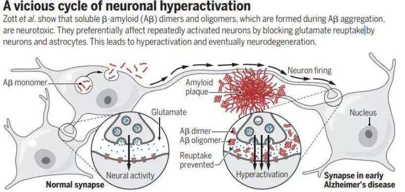 谷氨酸是帮助神经元之间传递信号的神经递质中的最重要的一种化学物质,负责激活和连接神经元的信号传输。研究人员发现,在过度活跃的神经元的突触间隙中,谷氨酸浓度较高且持续时间过长。这背后也是由于β-淀粉样蛋白分子在“作祟”,它阻止谷氨酸从突触间隙转运出去,而且这种神经递质阻滞形成的谷氨酸过度活跃,是在β-淀粉样蛋白分子处在早期的可溶性介质时期就形成了,也就是等到斑块形成之后,已经是为时已晚。