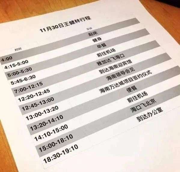 万达集团董事长王健林在24小时辗转两个国家、三座城市、飞行6000公里的日程表曾在网络引起热议;