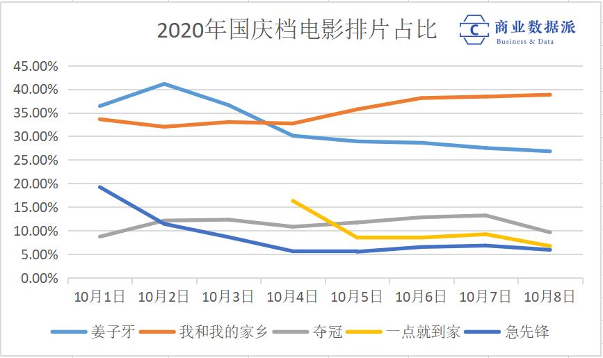 但今年国庆档并没有出现这样一部能够持续推动票房走高的一部影片。除了《我和我的家乡》上映前三天的票房浮动不超过0.4%之外,其他影片的日票房均呈下降状态。10月3日和4日虽然有《木兰:横空出世》和《一点就到家》两部新片上映,但却表现平平,并没有拉动大盘的能力。