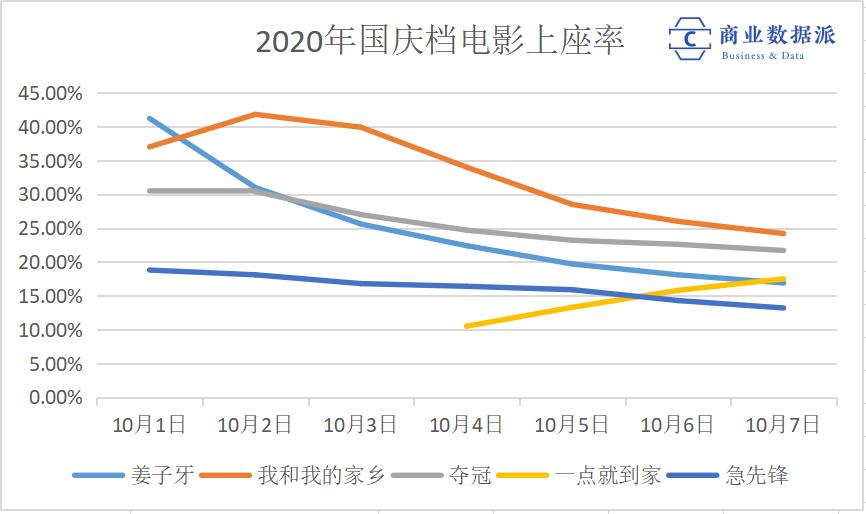 随着时间的推移,大盘也开始出现明显的降幅。10月7日的3亿票房已不足1日的一半,每日降幅在9%-15%之间。这当然也是历年重要档期中常见的现象。虽然排片场次没有明显的变化,但走进电影院的观众却在逐日下降。