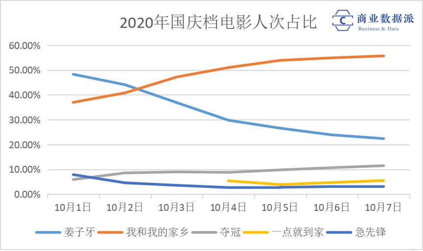 上映第7天,《我的我的家乡》已经成为了国庆档首部票房突破15亿的电影。观影人次占比和排片占比都在10月3日之后一路高走。从4日至7日,《家乡》的排片占比在32%-39%之间,而人次占比均超过了50%,超过了《姜子牙》《急先锋》《一点就到家》等电影的总和。
