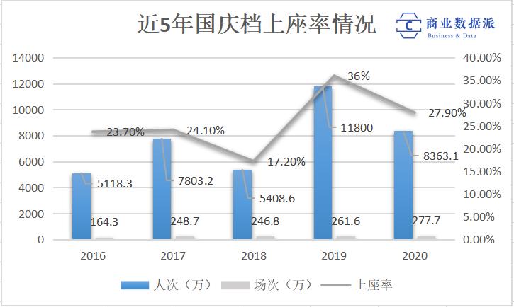 这与去年国庆档7天创下的44.66亿票房相比,的确有一定的下降。但鉴于2019年中国成立70周年的主旋律氛围的烘托,以及今年受疫情影响上座率不得超过75%的硬性条件,使这两期的国庆档并不在同一个起跑线。单看今年的国庆档成绩,无论是票房还是观影人次,与2018年以前的同档期相比,都有成倍的增加。
