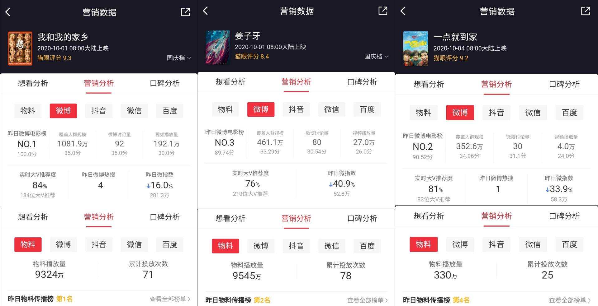 不足的是,《一点就到家》的宣发动作较少,且渗透率也比较一般。根据猫眼专业版的营销数据显示,《一点就到家》的物料播放量仅有330万,远不及《姜子牙》和《家乡》的9000多万,微博讨论量也非常低。