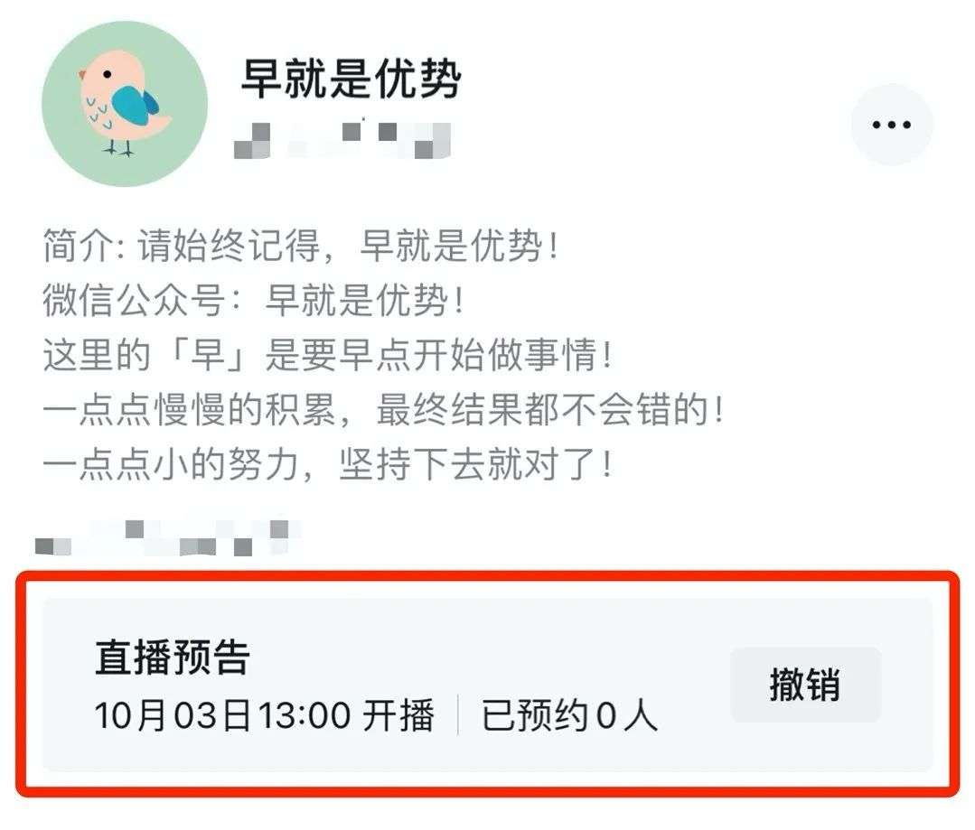【直播预告】创建成功后,预告提醒可显示在视频号主页面,其中包括开播时间、预约人数,视频号作者还可以选择【撤销】该预告。