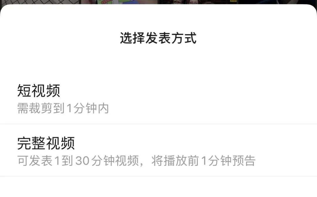 第二种为内测的新功能,即允许用户发表1到30分钟(此处也有部分网友显示可发表1到15分钟)的长视频。