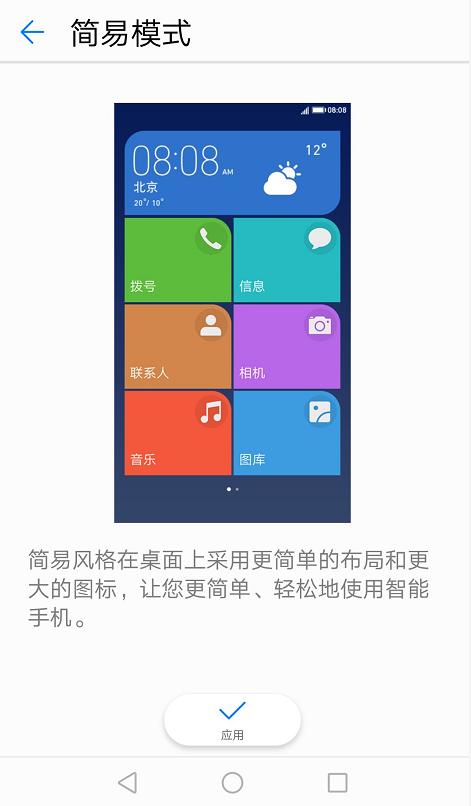 华为、小米等手机厂商均推出了适用于中老年人的简易模式、极简桌面,可以自行放大图标和字体、绑定桌面图标、语音播报和一键拨号,支持关闭下拉通知栏、进行远程桌面连接等。