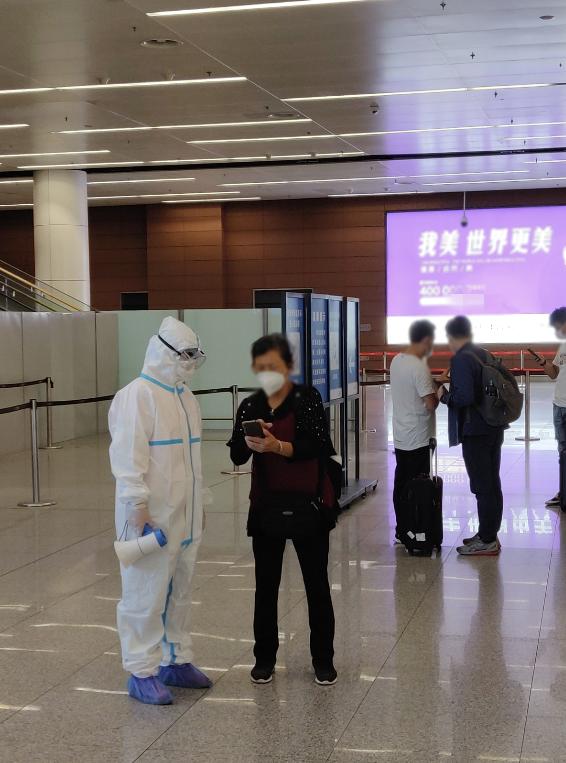一位旅客正在向机场工作人员请教如何扫码登记。图/新浪科技