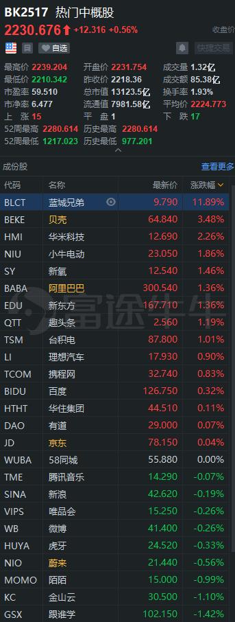 其他热门中概股方面,新浪跌0.19%;新浪微博跌0.26%;趣头条涨1.19%;蔚来跌0.56%;爱奇艺跌2.75%;陌陌跌0.99%;欢聚时代跌1.76%;虎牙跌0.33%;哔哩哔哩跌2.24%;优信涨10%;理想汽车涨0.9%;小鹏汽车跌1.49%。