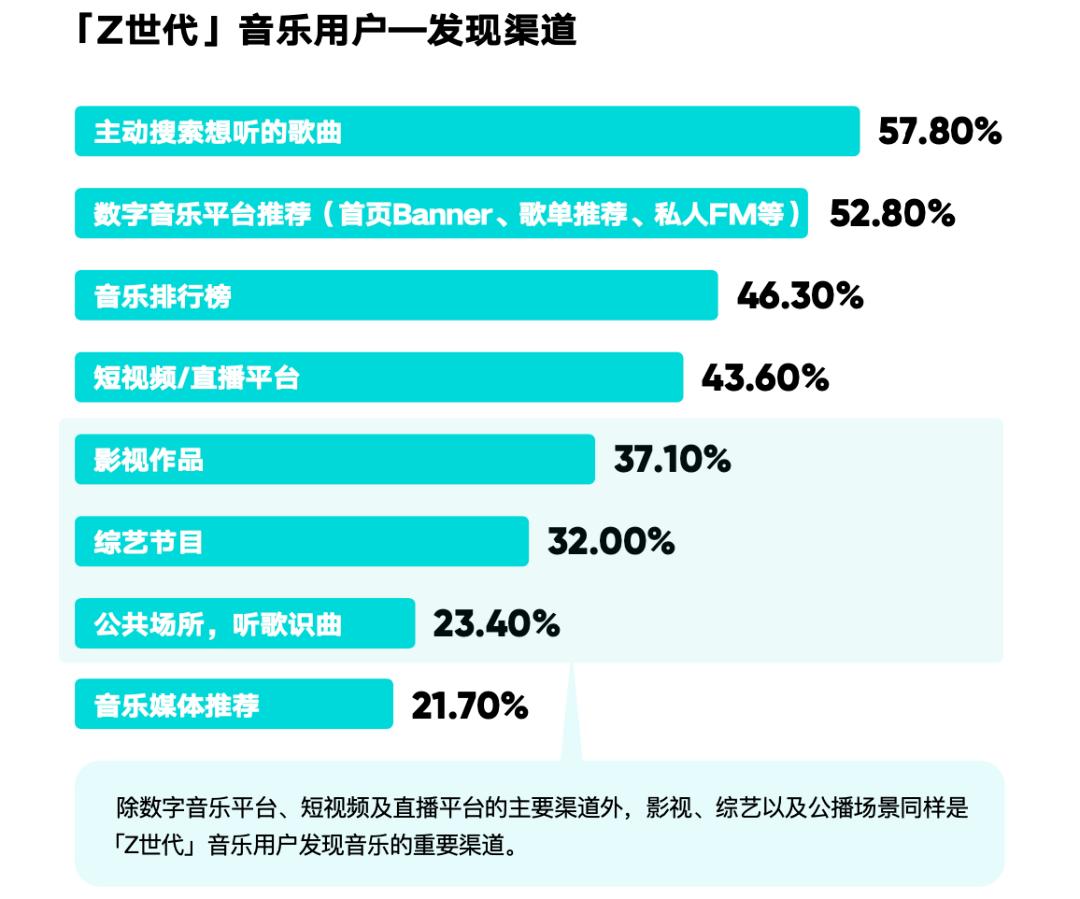 对于「Z世代」来说,除了自己主动搜索的方式,包括首页Banner、歌单推荐以及私人FM在内的数字音乐平台的推荐较为受用,此外影视、综艺以及公播场景同样是该群体发现音乐的重要渠道。此外,相比男性用户更倾向音乐平台推荐,女性更容易从影视、综艺及短视频等其他渠道中发现音乐。