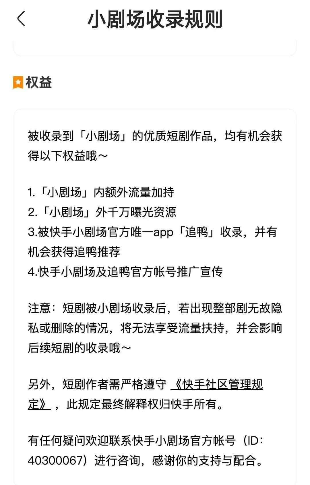 记者在快手上观看的短剧,只有1分半左右一集时长,内容极度浓缩,类似长剧的花絮剪辑,核心内容集中在一起不掺半点水分。在快手短剧的页面上,记者发现有古风、校园、爱情,再到搞笑、都市、励志等11个分类的短剧可供用户选择。为了充实短剧内容,快手还在小剧场的介绍页面显示出:流量加持、曝光资源、被“追鸭”收录等福利吸引创作者加入。