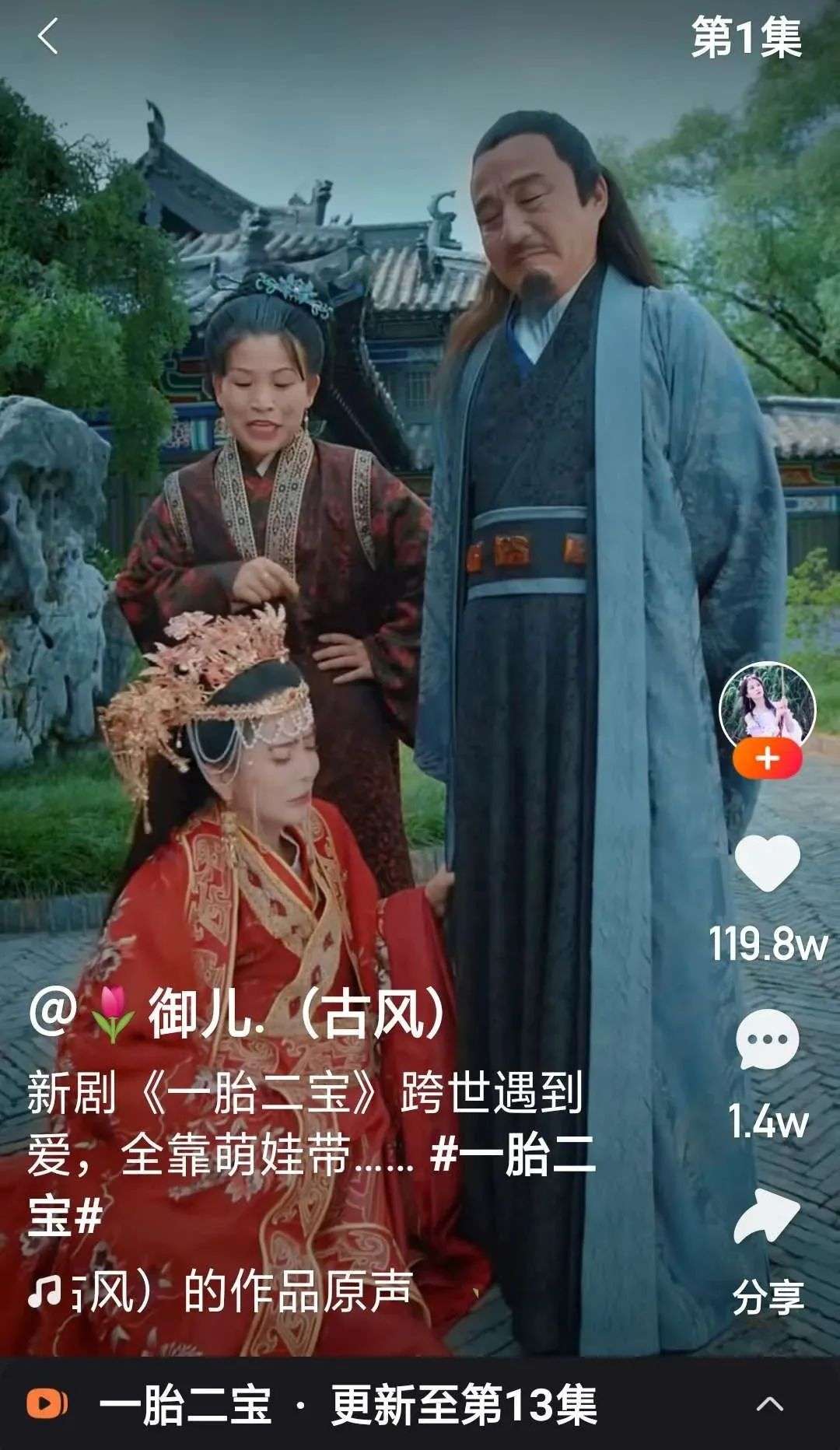 《一胎二宝》是快手首部采取分账政策的短剧,目前视频播放总量已突破1亿,创造了百万收益。记者观看时发现,这部古装短剧的服化道、制作都是专业“上星剧”的水准,剧情也是环环相扣,关注此剧的粉丝已经超过1659.7W用户。