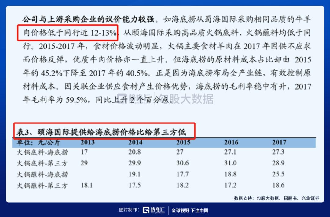 且有关联交易价格偏低的先例在:牛羊肉供应商蜀海国际向海底捞的销售价格低于同行近12%-13%,火锅底料供应商颐海国际的销售价格也是低于向第三方的采购价格。