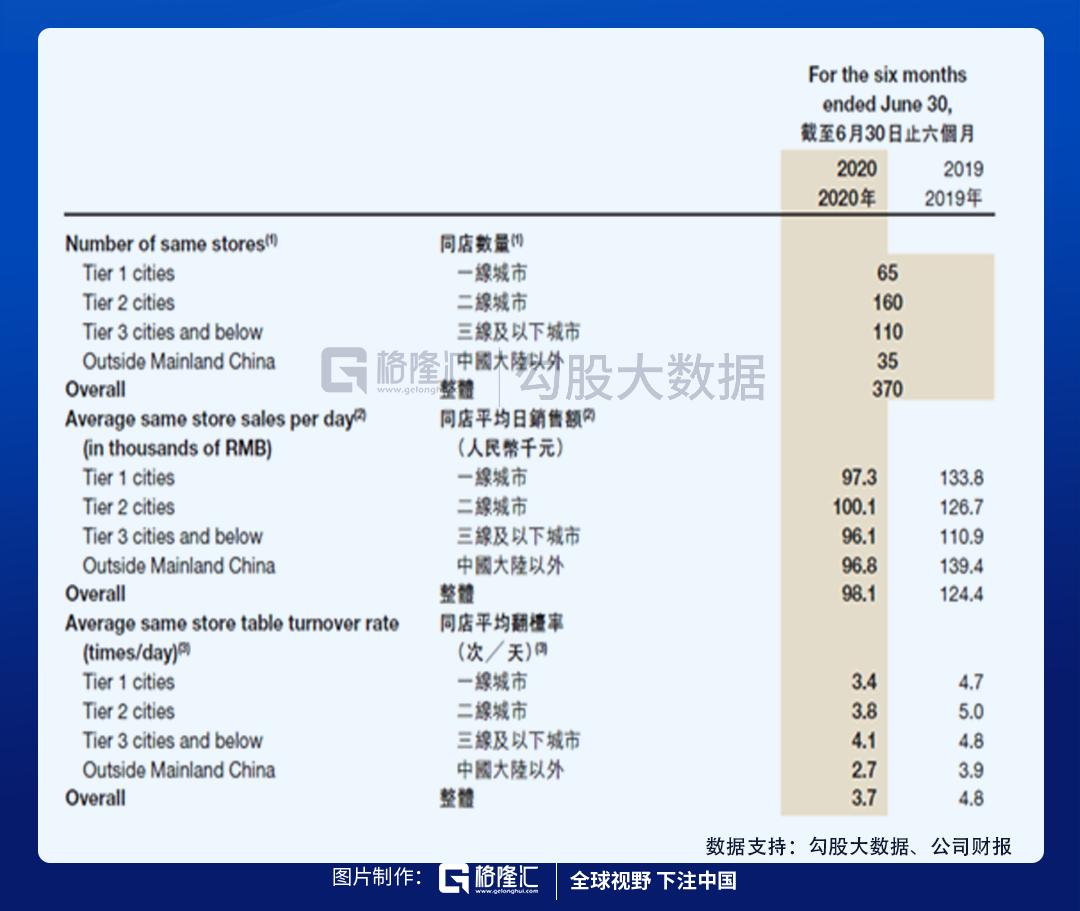 2020年上半年,海底捞的整体翻台率和同店翻台率(衡量老店的运营效率)均出现了大幅下滑。分别从去年同期的4.8降低至3.3,以及从4.8降低至3.7。