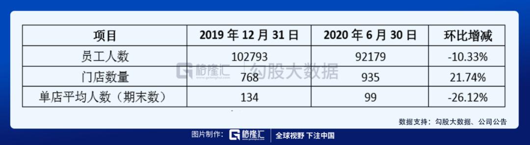 2020年上半年,海底捞新开门店173家、关闭门店6家,也就是说净新增门店167家,环比增长21.74%,逆势扩张的同时,员工总人数却减少了10,614人,环比减少10.33%。简单对比员工人数与餐厅数量,单店平均人数出现了较大的下滑,从19年的134人下降到99人。