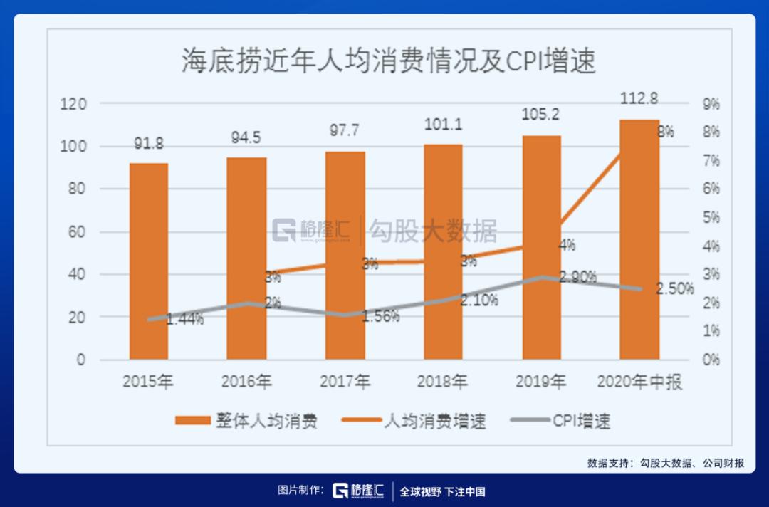 唯一不同的年份是2020年中报:海底捞的客单价提升8%,CPI增速从上年的2.9%下滑至2.5%。
