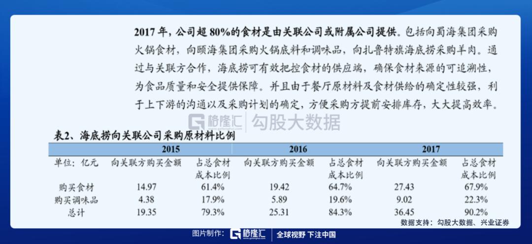 根据公开资料,海底捞无论从底料生产、食材加工、仓储物流、门店装修施工,人力咨询等方面都主要在依赖关联方。