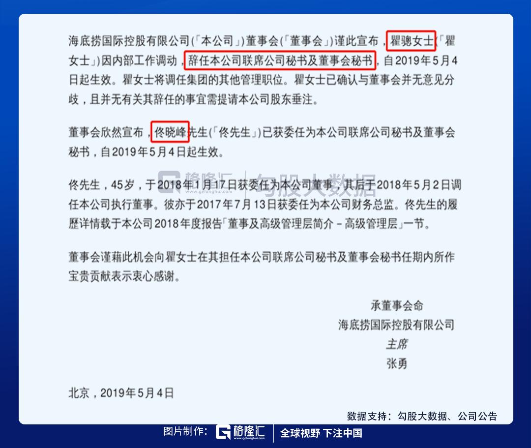 海底捞是2018年9月上市的,2019年5月4日,海底捞联席公司的秘书及董事会秘书调离工作岗位,由原本担任公司财务总监的佟晓峰先生担任公司的联席公司秘书和董事会秘书。