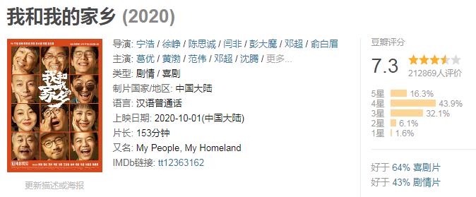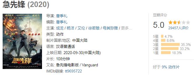 不止《我和我的家乡》《姜子牙》,今年国庆档影片普遍不及去年,《夺冠》豆瓣评分7.3,《急先锋》豆瓣评分5.0。