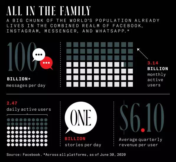 与之形成鲜明对比的是Rooms,一款Zoom式的视频会议服务,先于COVID-19在美国大流行几个月的今春就推出了。尽管Rooms是Messenger的正式组成部分,但它也可以从Facebook、Instagram以及WhatsApp启动。其他最近推出的产品,比方说Facebook Pay和Facebook Shops,也遵循类似的“一站式”服务战略。(今年8月,该公司将其所有与支付相关的实施机构合并为一个名为Facebook Financial的新集团,由曾任PayPal总裁的前Messenger CEO David Marcus担任领导。)