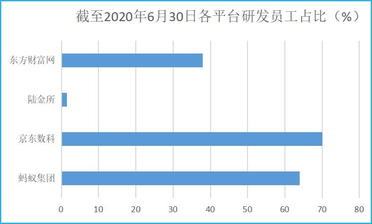 在人员配比方面,截至2020年6月30日,在蚂蚁集团超过1.6万名员工中,超过64%是技术研发人员;京东数科共有在岗员工数9989人,其中研发人员及专业人员占到公司员工总数的约70%;同期陆金所拥有84830名全职员工,其中技术研发员工人数为1252人,占比仅为1.5%。按照最近披露的数据,在2019年末,东方财富网研发人员1726人,占员工的比例为38%。