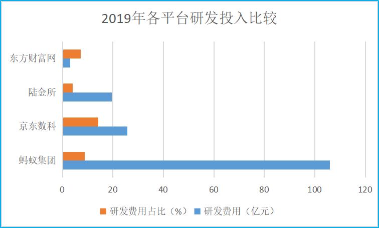 2019年,蚂蚁集团研发费用达106亿元、相当于营收的8.8%;京东数科同期研发费用25.67亿元,占当期营业收入的14.1%;东方财富网研发投入3亿元,占营业总收入比例为7.2%。而同期陆金所技术方面支出19.5亿元,相当于营收的4.1%。