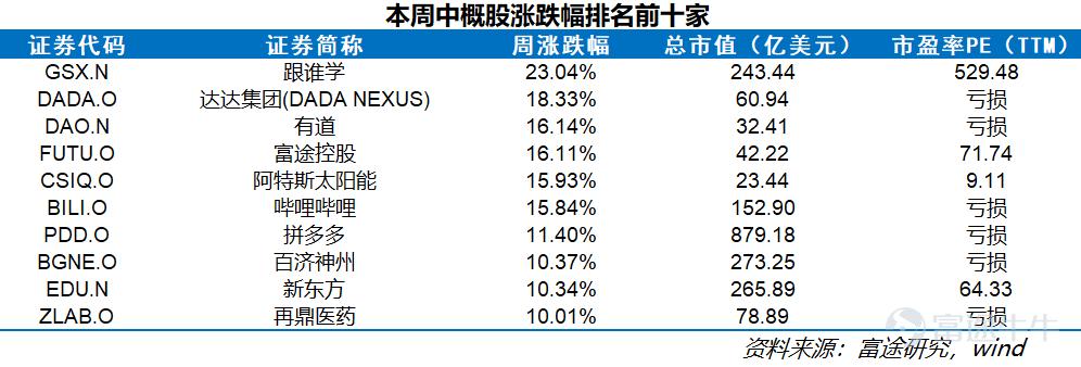 同时,本周$有道(DAO.US)$、$新东方(EDU.US)$两家中概教育股亦表现不俗,周涨跌幅均超过10%。