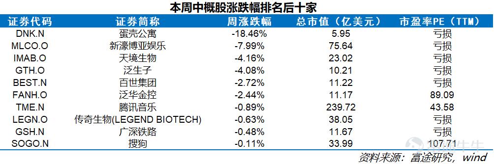本周中概股等权重指数上涨4.07%,在美股大势走强的背景下表现不错,中概股指数中有48家股价上涨,周涨幅超过10%的公司合计有10家。本周中概股热点集中于在线教育、互联网金融、在线视频等板块之中,「宅经济」模式仍受到资本市场的追捧。
